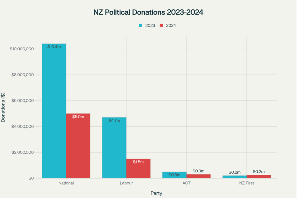 New Zealand political party donations 2023-2024, showing National Party received more than double Labour’s donations and over 20x ACT’s donations