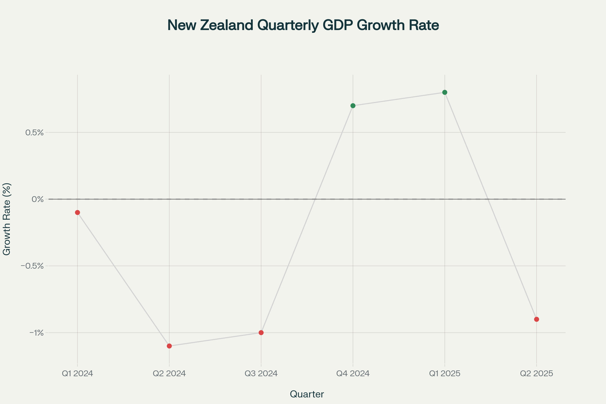 The reality tells a starkly different story. In the June 2025 quarter, the New Zealand economy contracted by 0.9%, reversing the previous quarter’s 0.8% growth and plunging the country back into recession, as reported by 1News. According to Trading Economics, GDP has now fallen in 3 of the last 5 quarters, with annual GDP contracting 0.6% in the year to June.