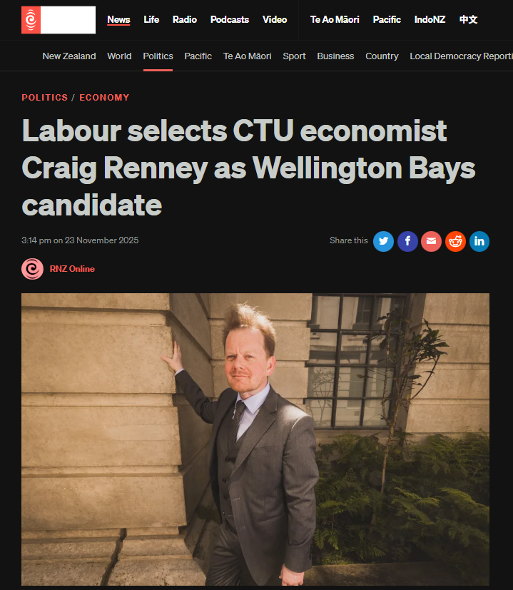 Within months of joining the CTU, Renney was publicly attacking the National-led government’s fiscal policy—adopting the right posture, but from an organization nominally independent of Labour. Then, in November 2025, barely two years into his CTU role, Labour selected Renney as its candidate for Wellington Bays, a newly created electorate previously held by the Greens.