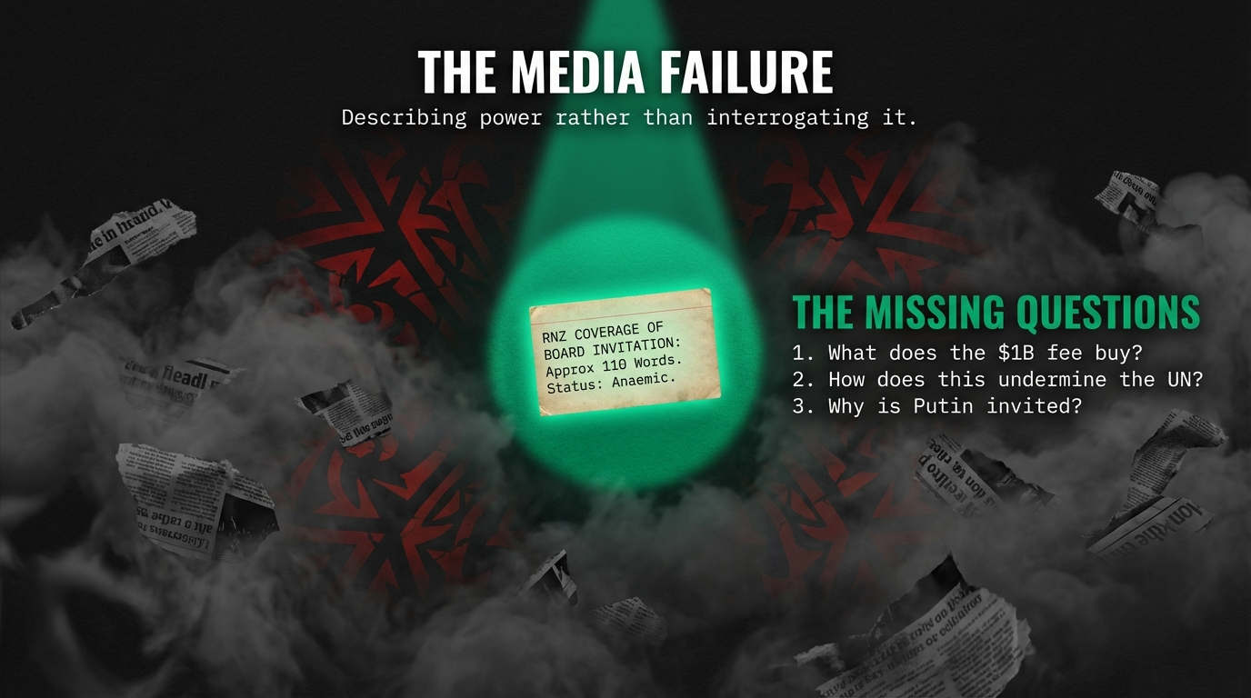 Reporting on the Gaza Board of Peace invitation has been even more anaemic. The RNZ piece on Luxon’s invitation runs barely 110 words. The structural features of the Board—the Chairman’s veto, the billion-dollar permanence fee, the apparent ambition to function as an alternative locus of authority for conflict governance—are barely touched, if at all. Instead, the invitation is often treated as a curious diplomatic footnote, another item on the Prime Minister’s overflowing foreign-policy in-tray.