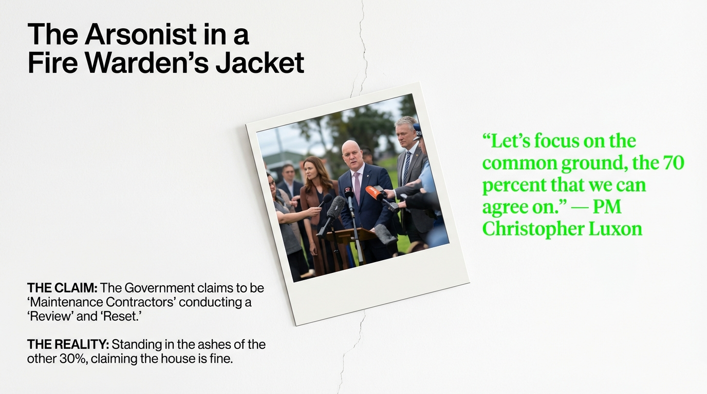 Christopher Luxon stands at Waitangi in a borrowed korowai, insists his government is not anti‑Treaty, and points to “common ground” like a man holding a fire extinguisher in one hand and a flamethrower in the other. He calls his meeting with iwi leaders “the best forum” he’s ever attended, praises “alignment”, and sells the illusion that shared language equals shared intent, as reported by RNZ. Meanwhile, the legislative record behind him is a smoking skyline of burned Treaty protections, dismantled Māori institutions, and weakened tikanga.