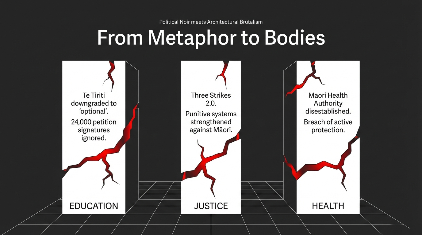 Tikanga impact: It relegates Te Tiriti from foundational covenant to optional garnish. It sidelines mātauranga Māori and tikanga from being essential knowledge for everyone in Aotearoa, turning them back into “nice‑to‑have add‑ons” instead of the bones of the house.