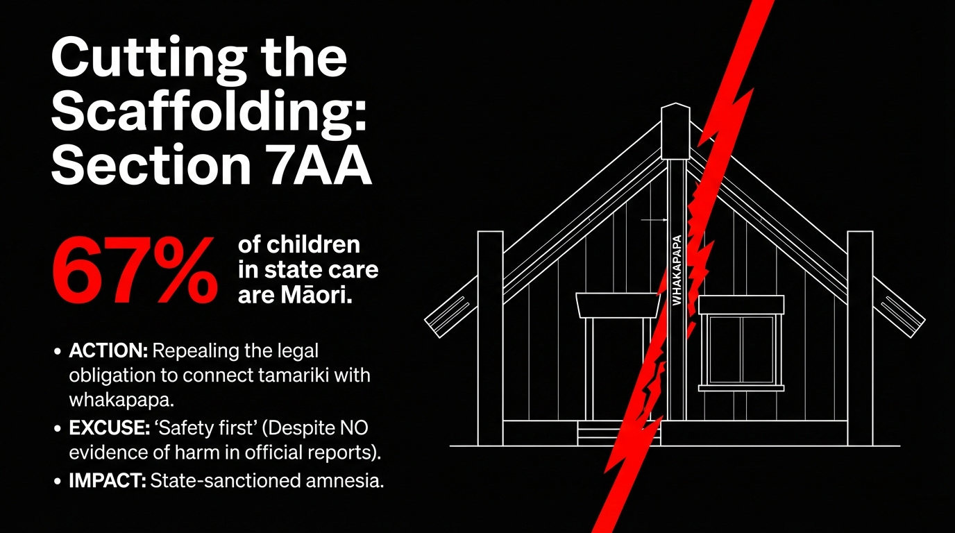 Tikanga impact: It shreds whakapapa (genealogical connection), weakens mana tamaiti (the child’s inherent dignity and standing), and hollows out whanaungatanga (relational obligations). It says: the Crown’s convenience comes before your genealogical survival.