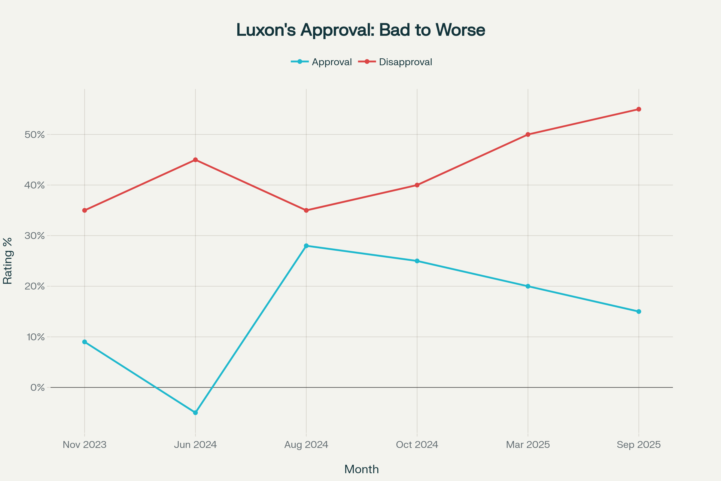 Chart showing Christopher Luxon’s declining approval ratings from November 2023 to September 2025, demonstrating his failure to connect with voters