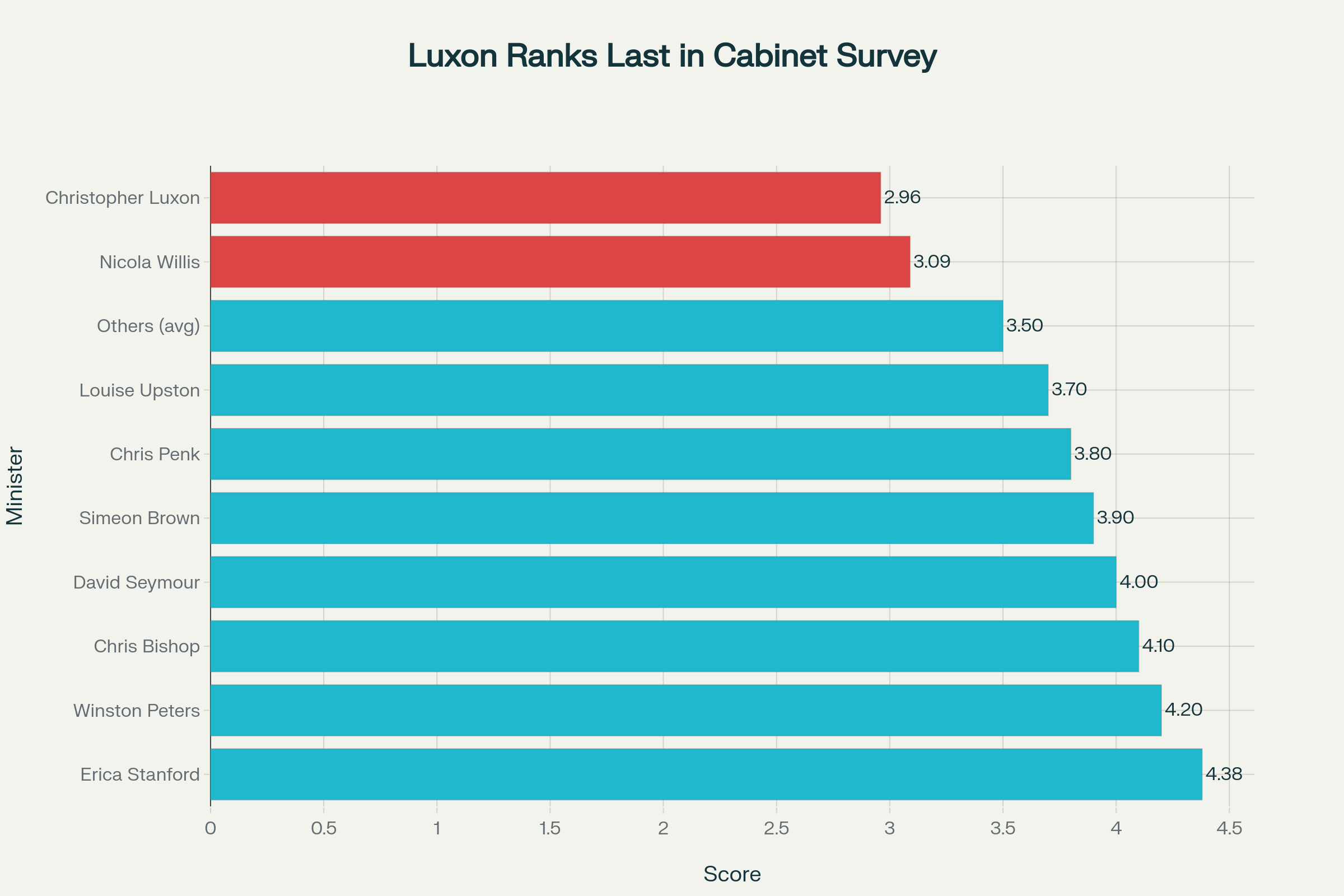 Chart showing Cabinet minister rankings from the 2025 Mood of Boardroom survey, with Luxon ranking poorly at 15th place