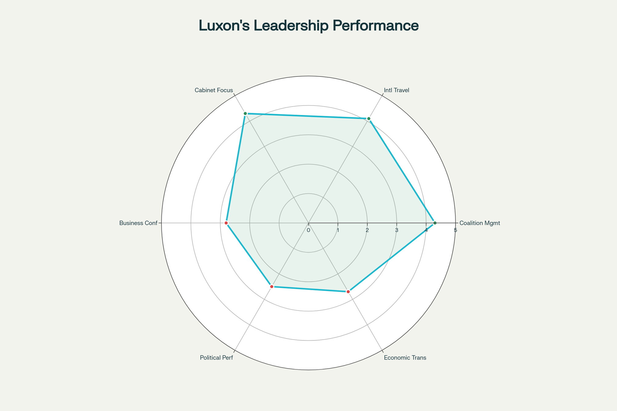 Radar chart showing Christopher Luxon’s performance strengths and weaknesses according to business leaders
