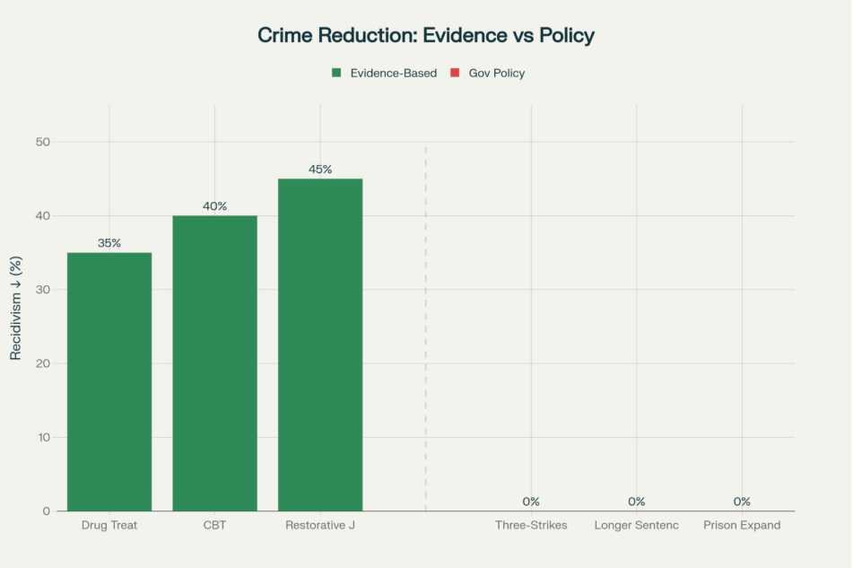 Dogma vs. Data: What Reduces Crime in NZ. Evidence shows Treatment, CBT, Restorative Justice work (35-45% recidivism reduction). Government ignores this, invests $billions in Three-Strikes and prisons with zero crime reduction.