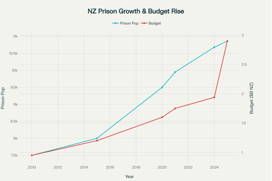 Rising Prison Population and Corrections Budget: 2010-2025. NZ has locked up 45% more people while spending 3x more on Corrections despite no evidence this reduces crime.