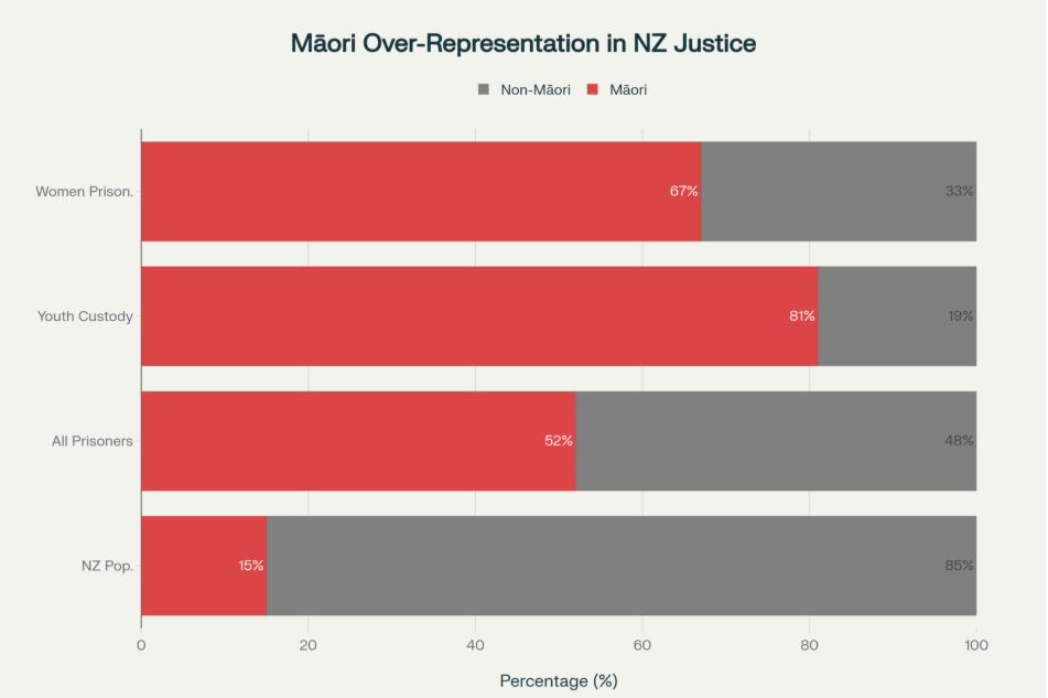 The result: Māori—15% of the population—now comprise 52% of prisoners, 81% of youth in custody, and 67% of women prisoners. This is not crime-fighting. This is systematic destruction of a people.[5][6]
