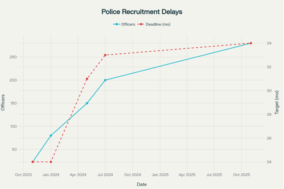 500 Police Officers Target: Four Delays and Counting. Coalition promised 500 new police by Nov 2025. Now delayed to Sept 2026—10 months late with only 280 recruited.