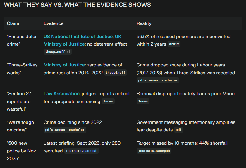 The hard facts Luxon is ignoring: Every major piece of international research—from the US National Institute of Justice to the New Zealand Ministry of Justice itself—confirms that prisons do not deter crime, do not reduce recidivism, and do not make communities safer. What actually reduces reoffending by 35-45%? Alcohol and drug treatment, cognitive behavioral therapy, and restorative justice. Yet Luxon’s government is investing $billions in the opposite: prison expansion, Three-Strikes sentencing, and the removal of funding for cultural background reports that help judges avoid crushing innocent Māori with unjust sentences.[2][3][4]