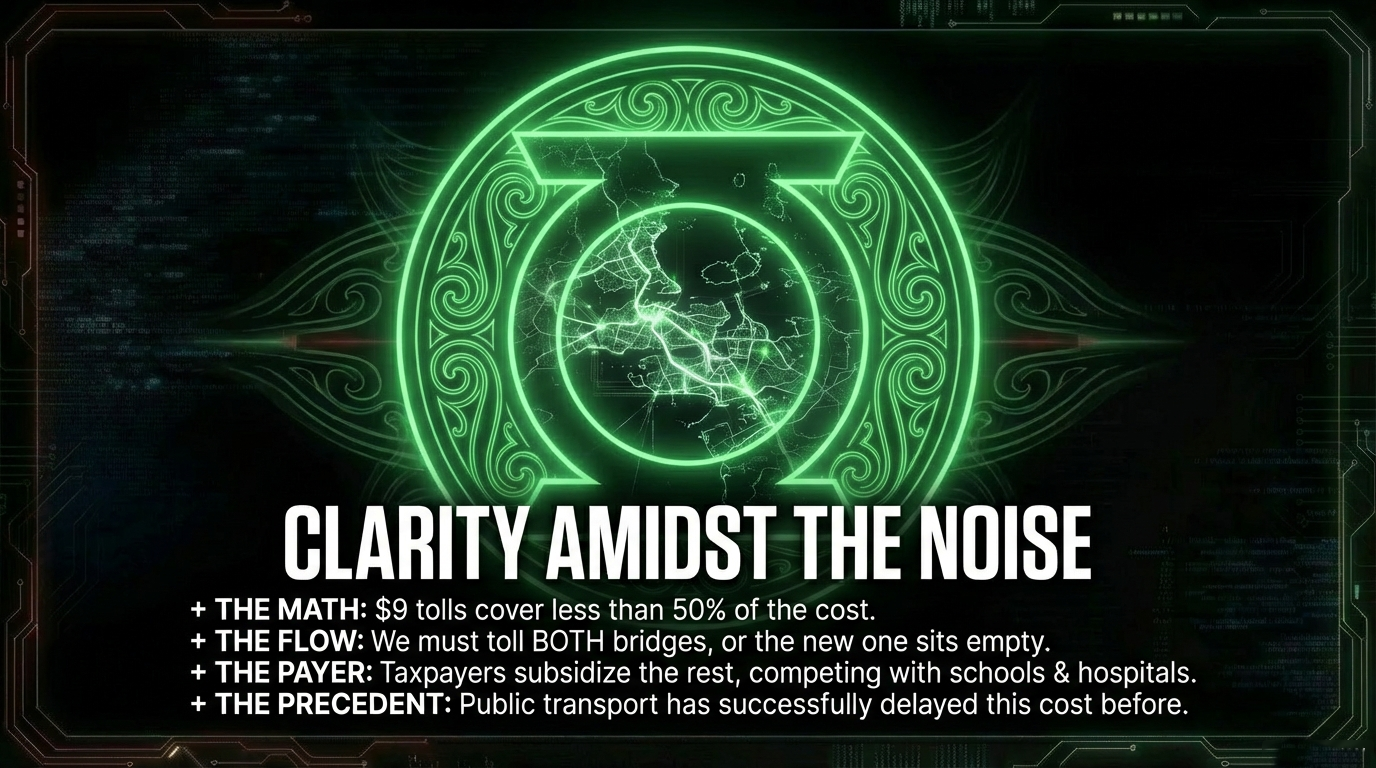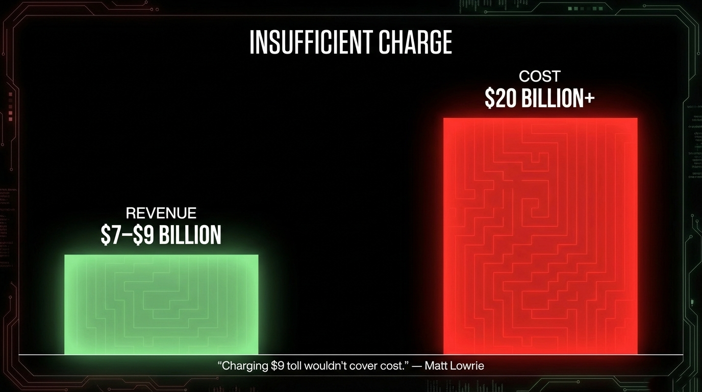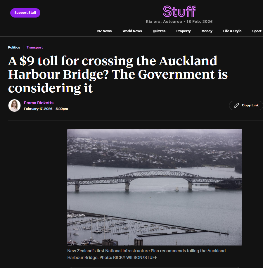 The problem? The new crossing is projected to cost over $20 billion. As Greater Auckland editor Matt Lowrie told RNZ, the toll wouldn't even cover the cost. The remaining tens of billions would come from — surprise — Crown investment. Which means your taxes. Which means the same people paying $9 a trip also subsidise the shortfall through every dollar they earn.