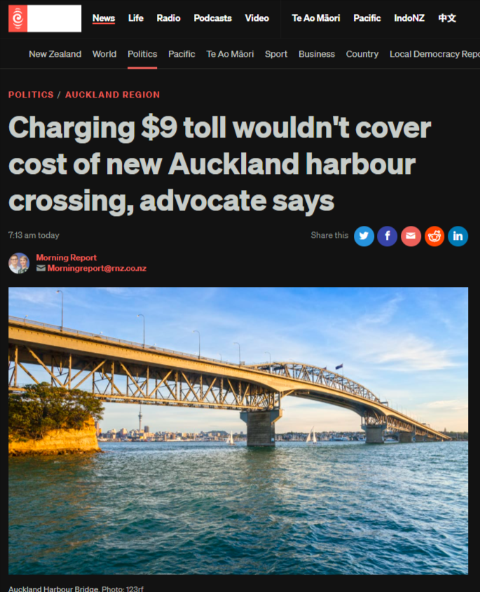 https://www.stuff.co.nz/politics/360939738/9-toll-crossing-auckland-harbour-bridge-government-considering-it; https://www.rnz.co.nz/news/political/587145/charging-9-toll-wouldn-t-cover-cost-of-new-auckland-harbour-crossing-advocate-says