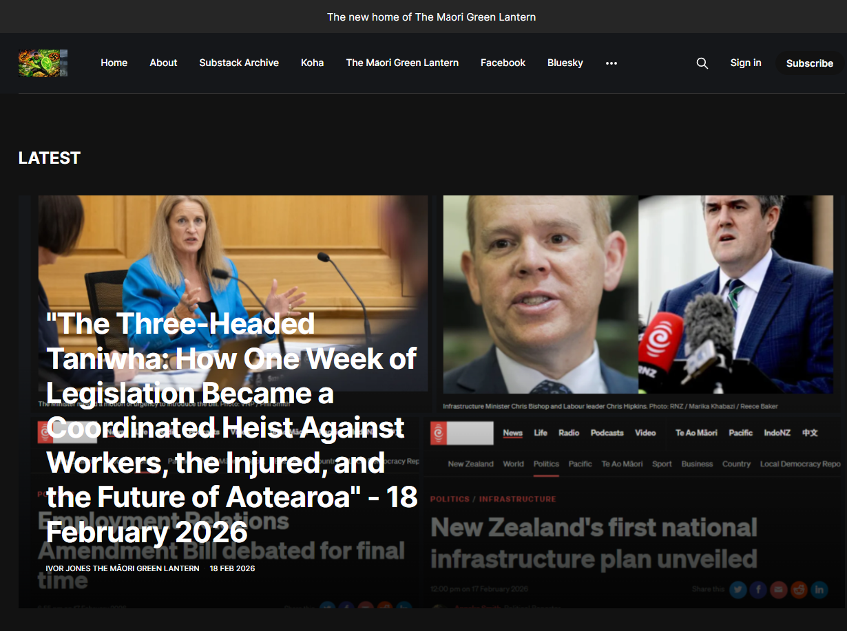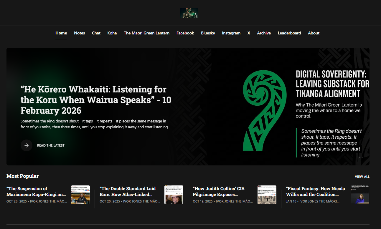 - Essays on infrastructure, housing, and systemic inequality are available on The Māori Green Lantern Substack