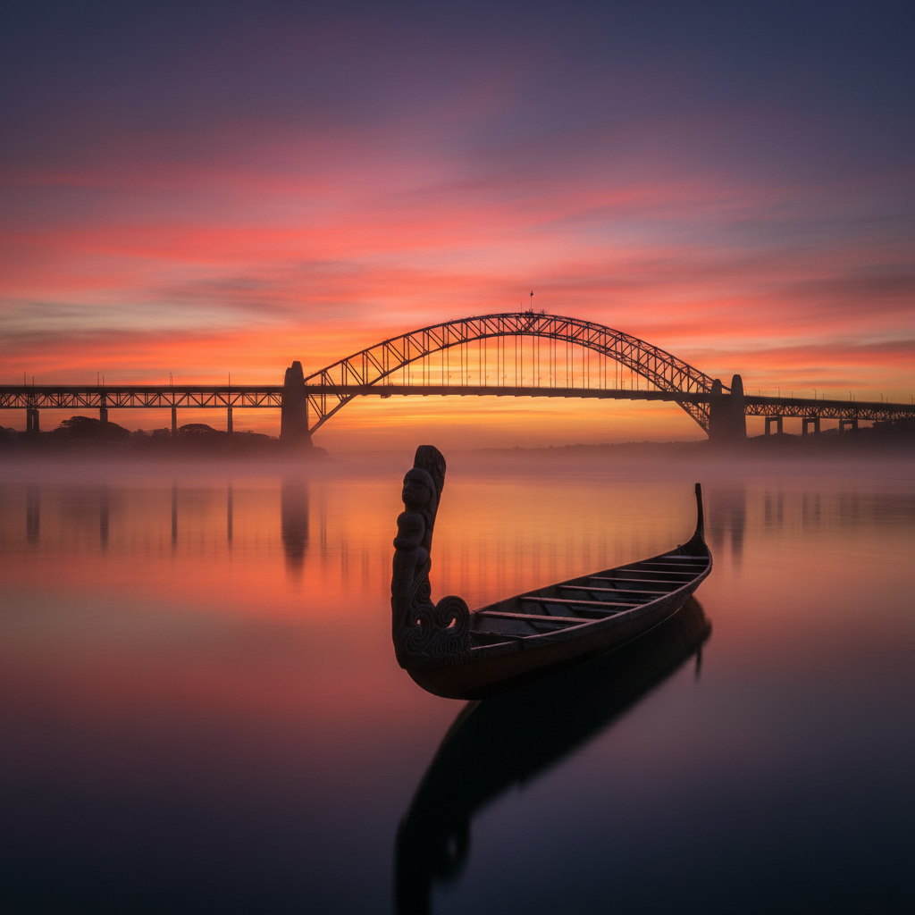 There is a pūrākau from the earliest Māori of Tāmaki Makaurau about the patupaiarehe — the fairy-like night dwellers — who tried to bridge the Waitematā with a stone causeway. They laboured through the darkness, but the sun rose before they finished, and they perished in its light. Their incomplete work became Meola Reef, stretching from Point Chevalier toward Kauri Point. The ancestors knew what it meant to build across these waters. They knew the price. And they knew that some crossings exact more than they give.