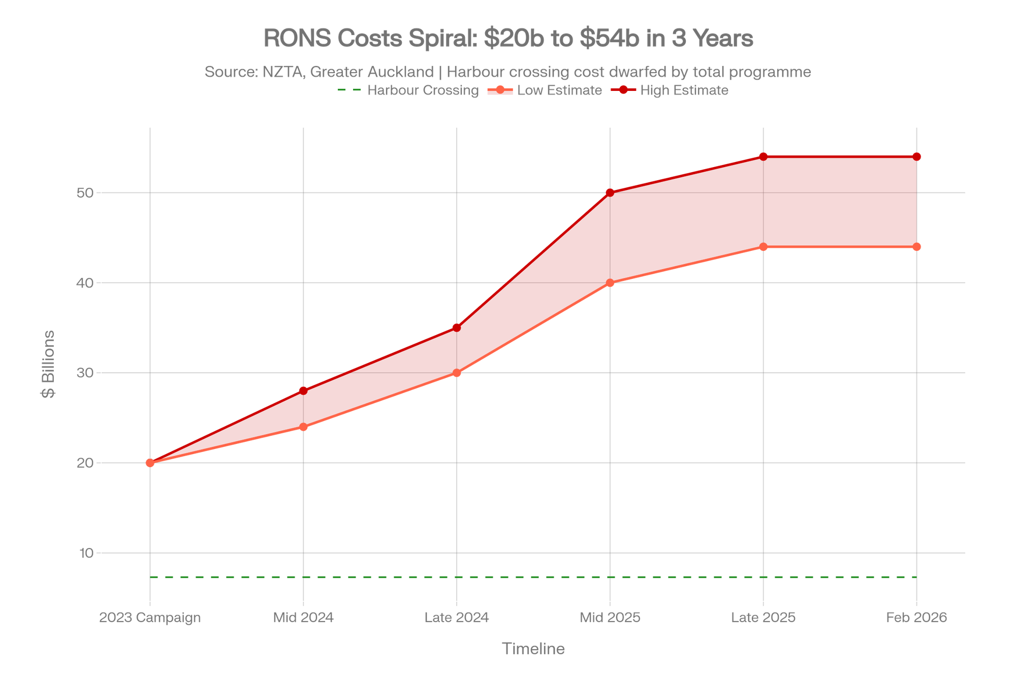 When National campaigned in 2023, the 17 RONS were costed at roughly $20 billion. By late 2025, that figure had ballooned to $44–$54 billion. That is 23 Dunedin Hospital rebuilds. That is half as much again as the entire 11,000-kilometre state highway network is worth. Eight of the roads had their costs increased by $5 billion in two years — without a single shovel hitting the ground.