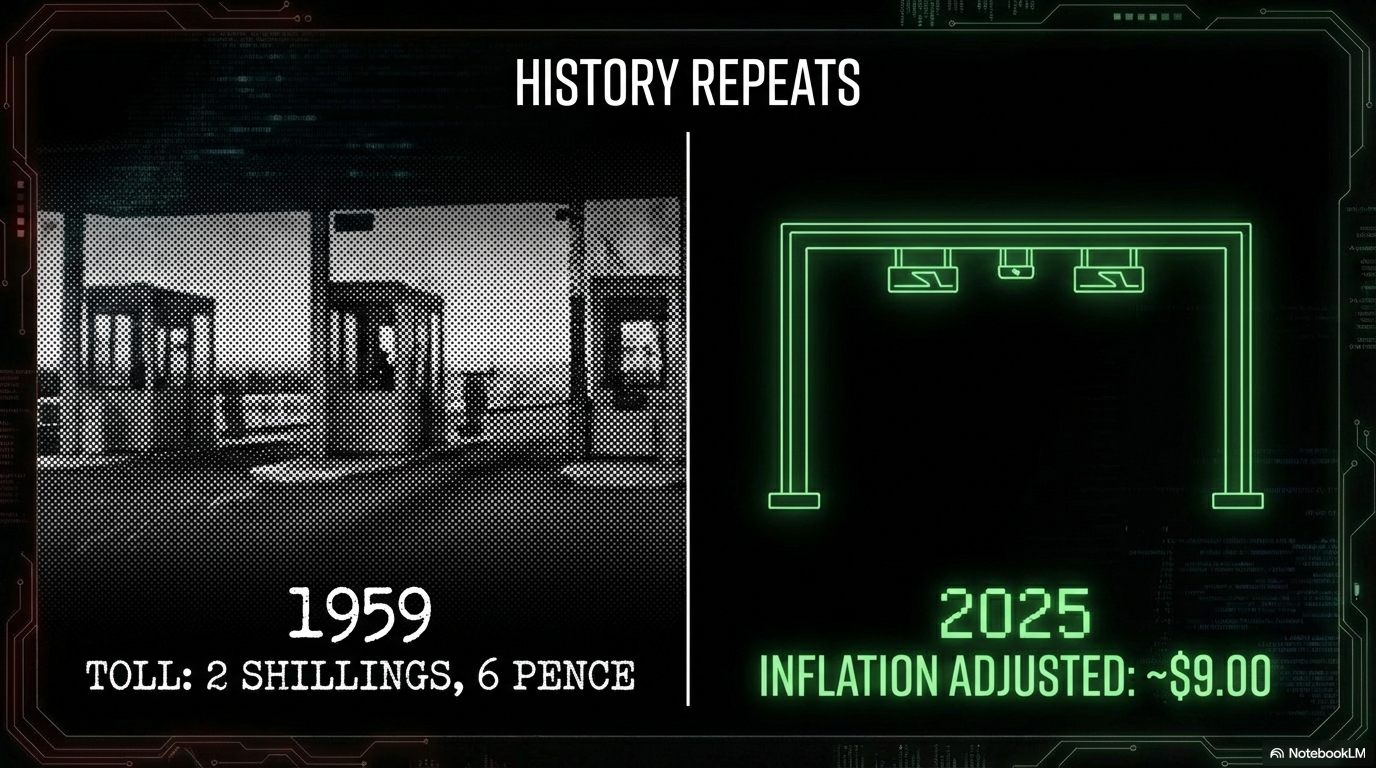 The Numbers: A $9 toll, twice daily, five days a week = $90/week = $4,680/year. For a household earning $50,000, that is 9.4% of gross income — consumed by a single toll.