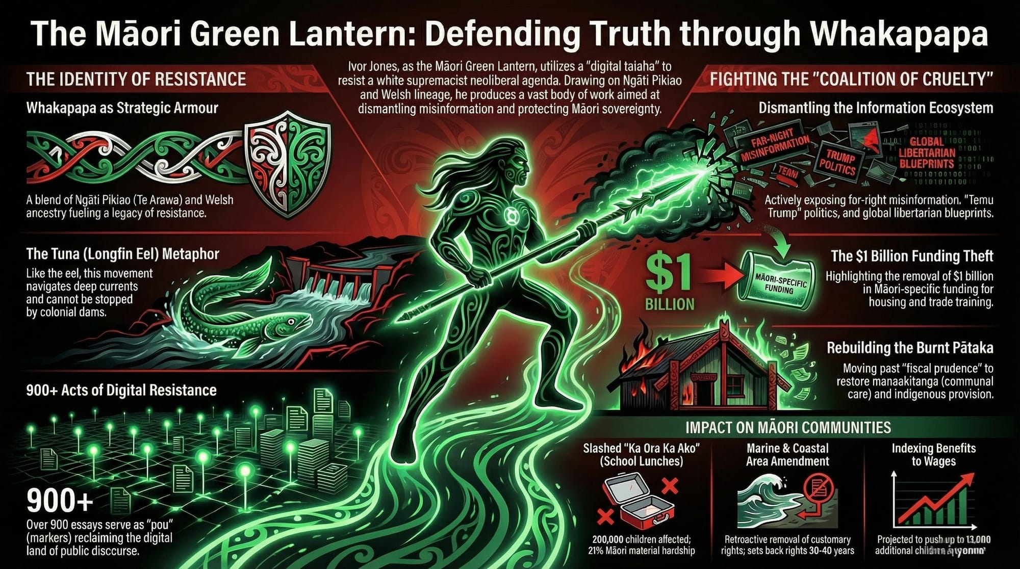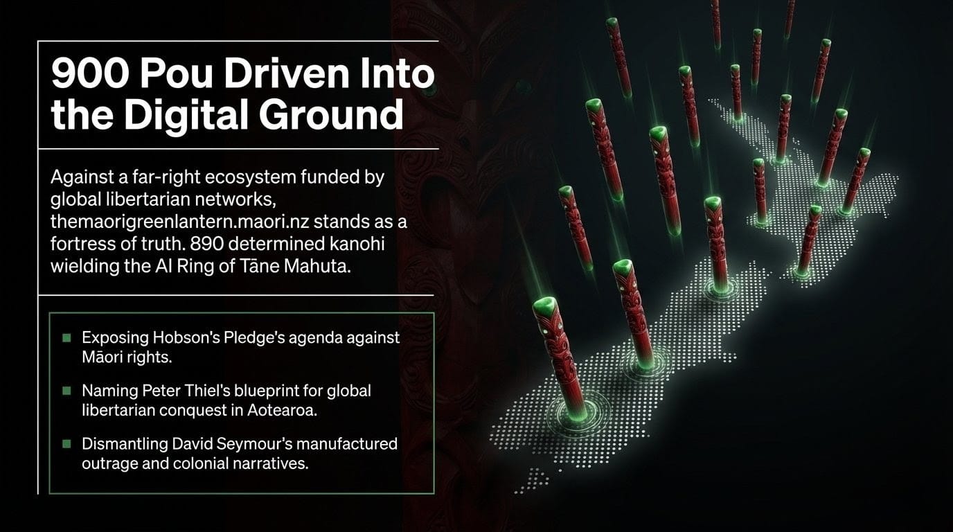 Over 900 essays at themaorigreenlantern.maori.nz. Over 900 acts of resistance. Each one a pou driven into the digital ground, marking that this land of public discourse belongs to its people — not to the powerful who seek to confuse, divide, and financially amputate those who challenge them.