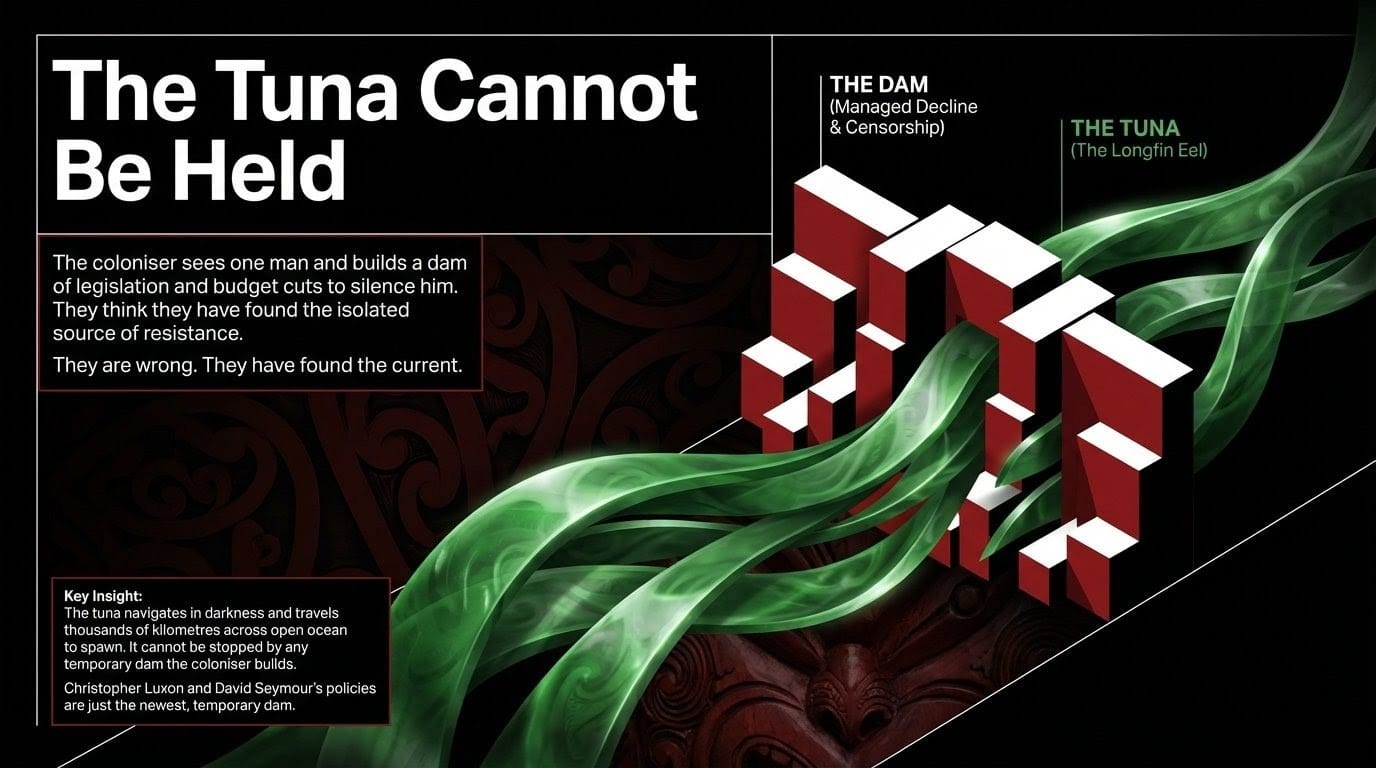 There is a creature in our waterways that your government has tried to exterminate for one hundred and fifty years. The tuna — the longfin eel — navigates in darkness, feels the currents of the deep, travels thousands of kilometres across open ocean to spawn, and cannot be stopped by any dam that the coloniser builds. It has been here since before your language existed. It will be here after your political party becomes a footnote.