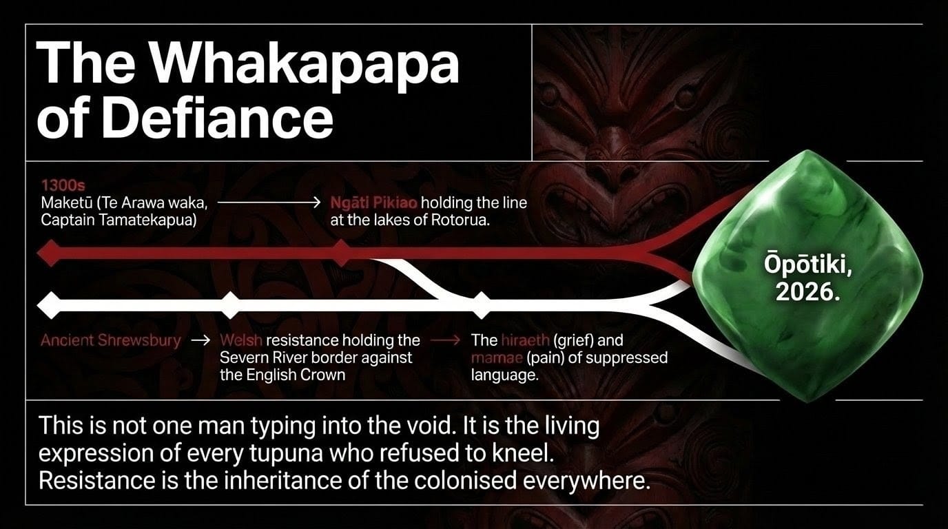 The Welsh call this bone-deep longing hiraeth — grief for home, for what was taken, for the self that colonisation tried to erase. Māori call it mamae. They are not the same. But they rhyme. And a man who carries both knows what the coloniser never taught in their schools: that resistance is the inheritance of the colonised everywhere. That the Border country of Shrewsbury, where Welsh blood held its line against English expansion for centuries, is genealogically connected to the lakes of Rotorua where Ngāti Pikiao held its line against all who came to take.