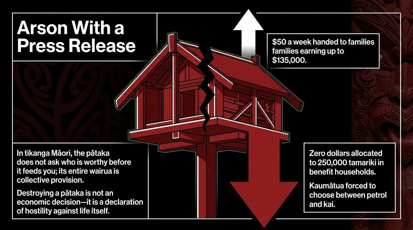 As documented in The Pātaka is Ash: How Nicola Willis and Christopher Luxon Poured Petrol on the Poor, while kaumātua chose between petrol and kai, while a quarter million tamariki in benefit households received zero — the Luxon government handed $50 a week to families earning up to $135,000 and called it compassion. That is not policy. That is arson with a press release.