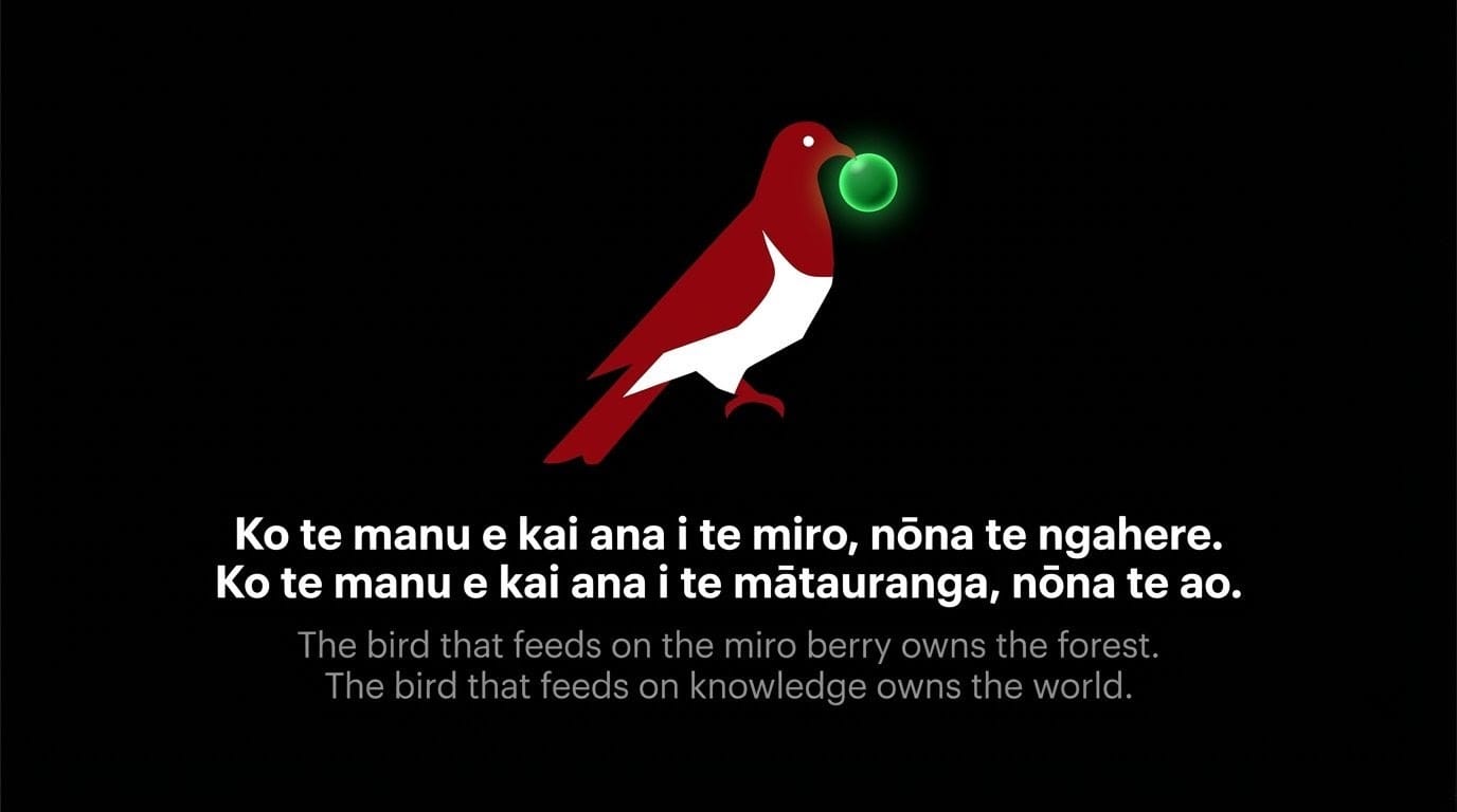 Ko te manu e kai ana i te miro, nōna te ngahere. Ko te manu e kai ana i te mātauranga, nōna te ao. The bird that feeds on the miro berry owns the forest. The bird that feeds on knowledge owns the world.