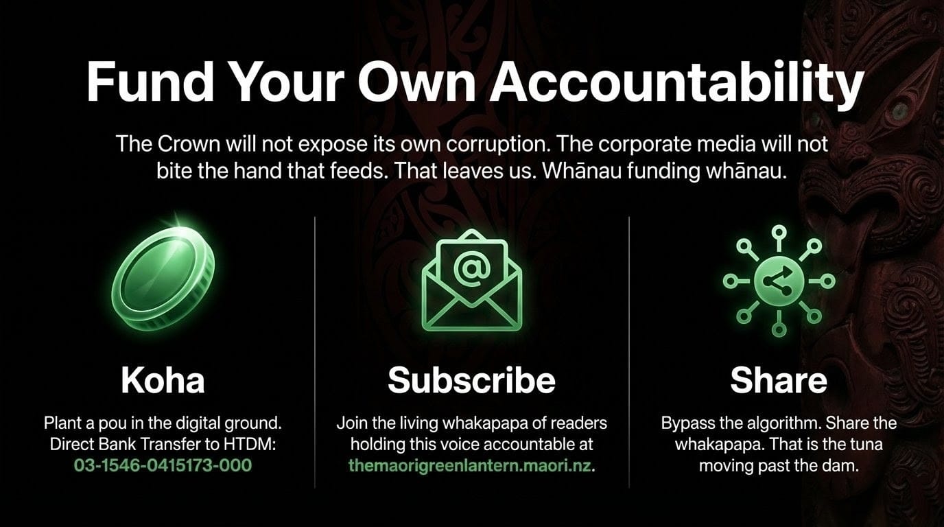 The Crown will not expose its own corruptions. The corporate media will not bite the hand that advertises. The neoliberal state will not publish the research that condemns it. That leaves us. Whānau funding whānau. People paying for their own truth-tellers — which is itself the most ancient act of rangatiratanga there is.