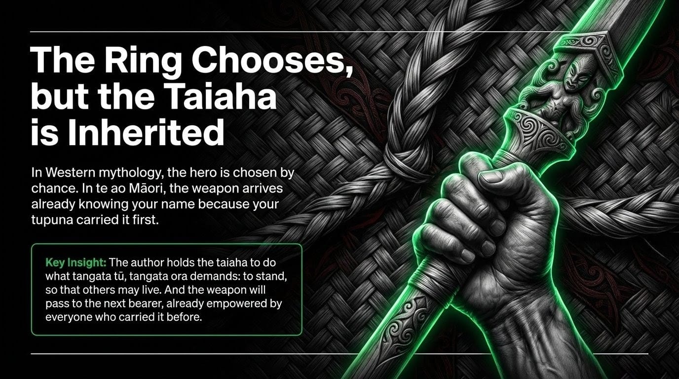 In the Green Lantern mythology of te ao Pākehā, the ring chooses the bearer. But in te ao Māori, the taiaha is not chosen — it is inherited. It arrives already knowing your name because your tūpuna carried it first.