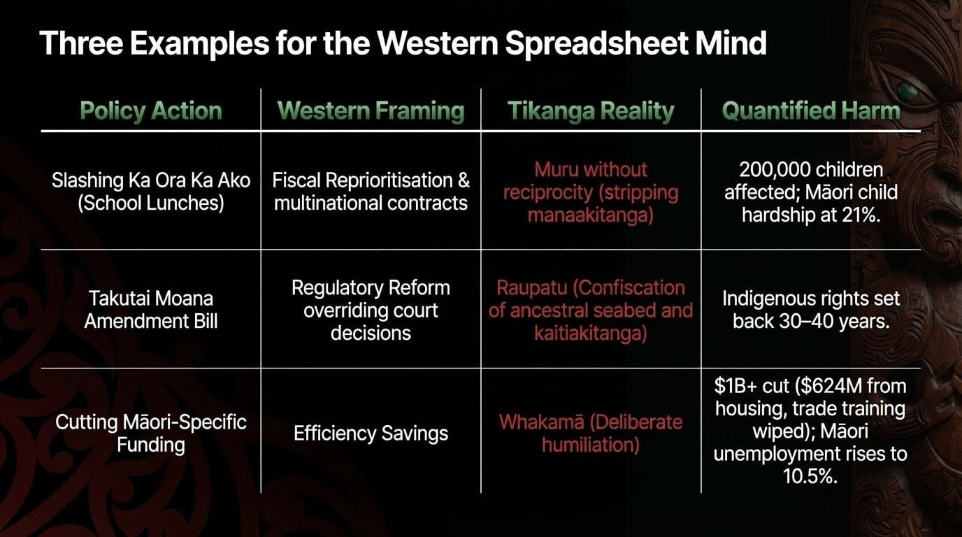The Western mind calls cutting the school lunch programme "fiscal reprioritisation." Tikanga calls it muru without reciprocity — taking without the obligations that even traditional Māori systems of sanction required.