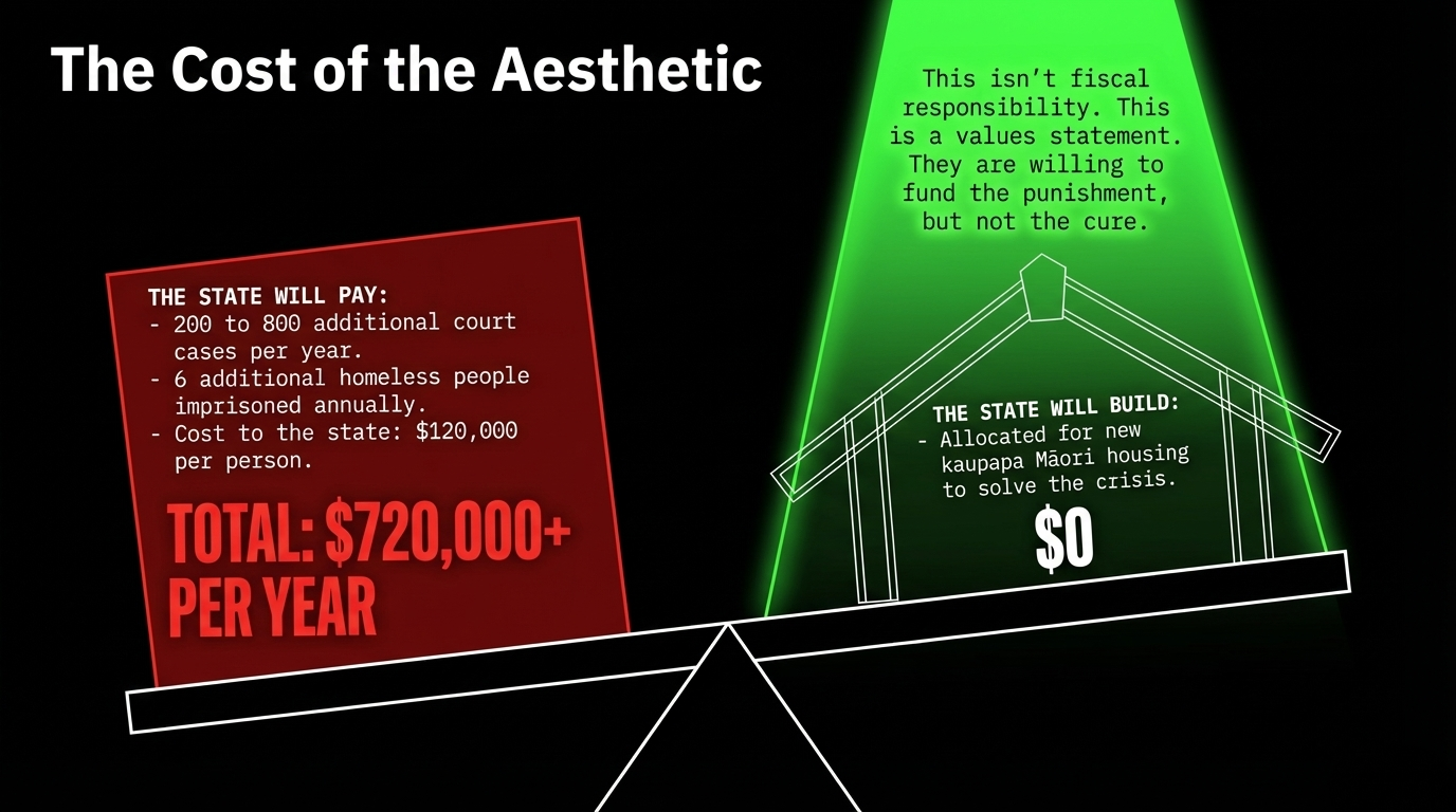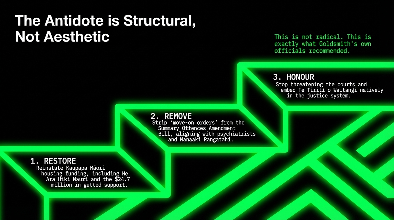His own Justice Ministry opposed it. His own Housing Ministry opposed it. Corrections warned the prisons were already full. The empirical evidence showed it would change nothing except the postcode of the suffering. Goldsmith read all of it, thanked his officials politely, and announced the policy anyway — because this was never about solving homelessness. It was about reclaiming the city centres for the comfortable, and sweeping the casualties of his own government's cuts out of the frame before the tourists arrive. As homelessness in Tāmaki Makaurau doubled from 400 to over 900 in a single year, and as Māori — 17 percent of the population — account for 31 percent of the severely housing-deprived, this law is not aesthetically neutral. It is a racial instrument dressed in civic language — and this essay names it exactly as that.