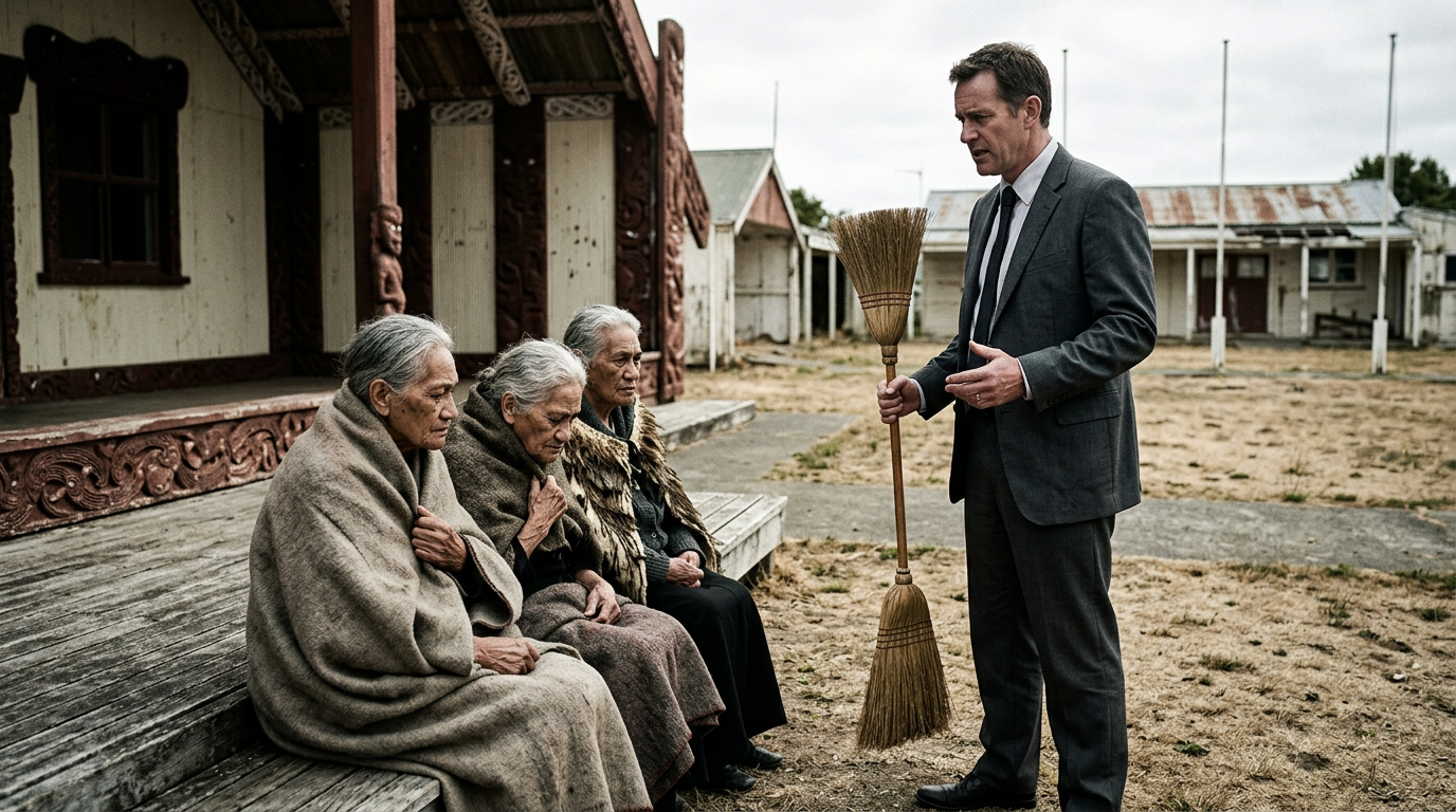Imagine a marae where the elders have been starved — stripped of resources, land, income. They sit on the paepae, thin and cold. The government arrives not with kai, not with kākahu — but with a broom. "You are cluttering the paepae," they say. "Move." And when the elders ask, "Move where?", the government says: "That is not our concern. Our concern is the aesthetic of this marae."