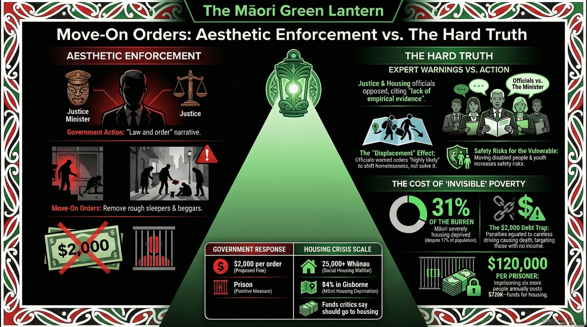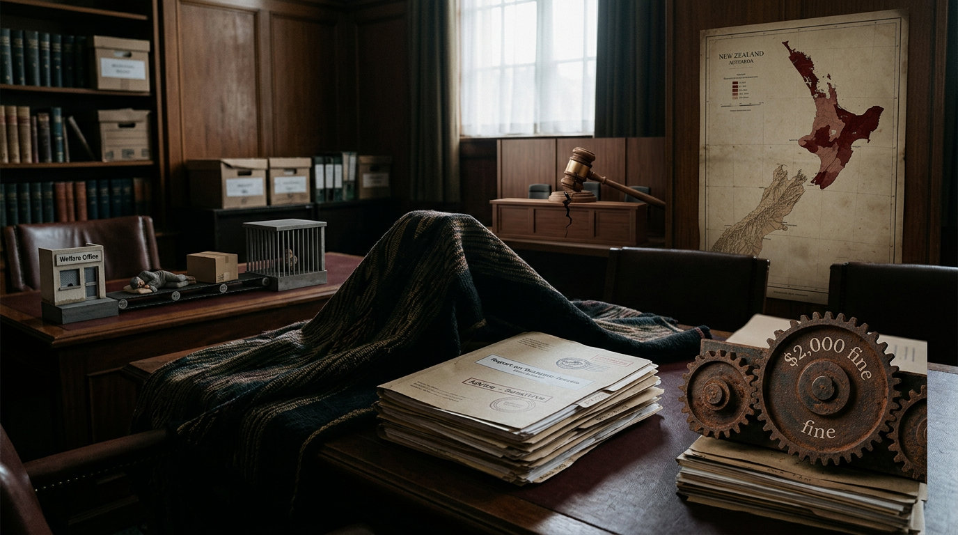 Five hidden connections are exposed: the systematic dismissal of official advice as standard practice; the debt-trap architecture of a $2,000 fine aimed at people with no income; the disproportionate Māori targeting embedded in the law's design; the parallel campaign to strip tikanga from the courts; and the conveyor belt from welfare punishment to rough sleeping to criminalisation that The Māori Green Lantern has previously mapped.