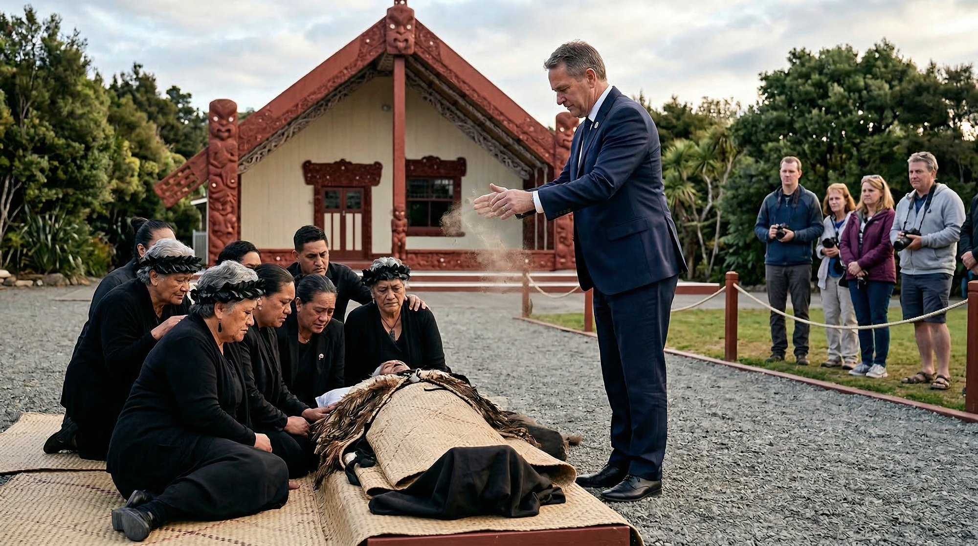 And the Minister of Justice arrives — not with resources, not with aroha — but with a tōpuni: a cloaking garment. He throws it over the tūpāpaku. He dusts his hands. He tells the tourists it is now safe to photograph the marae.