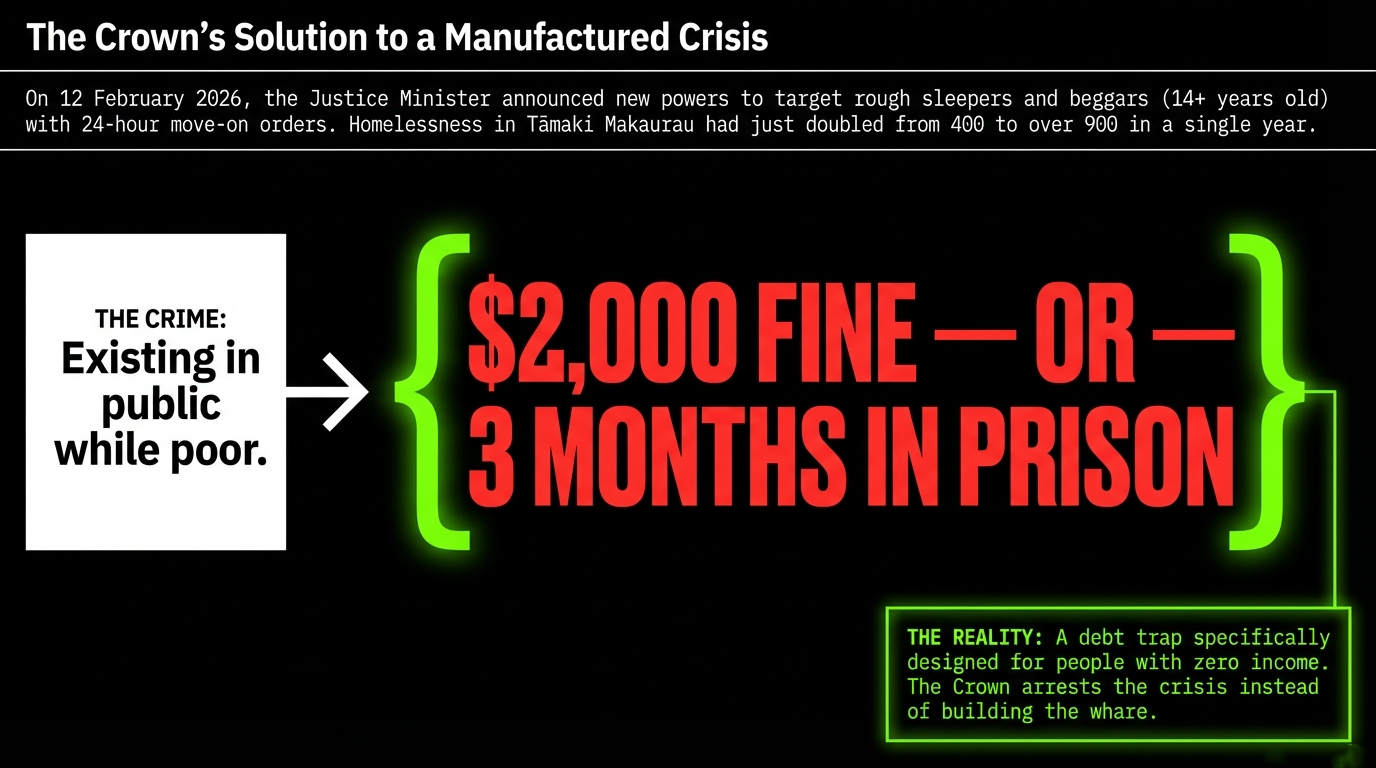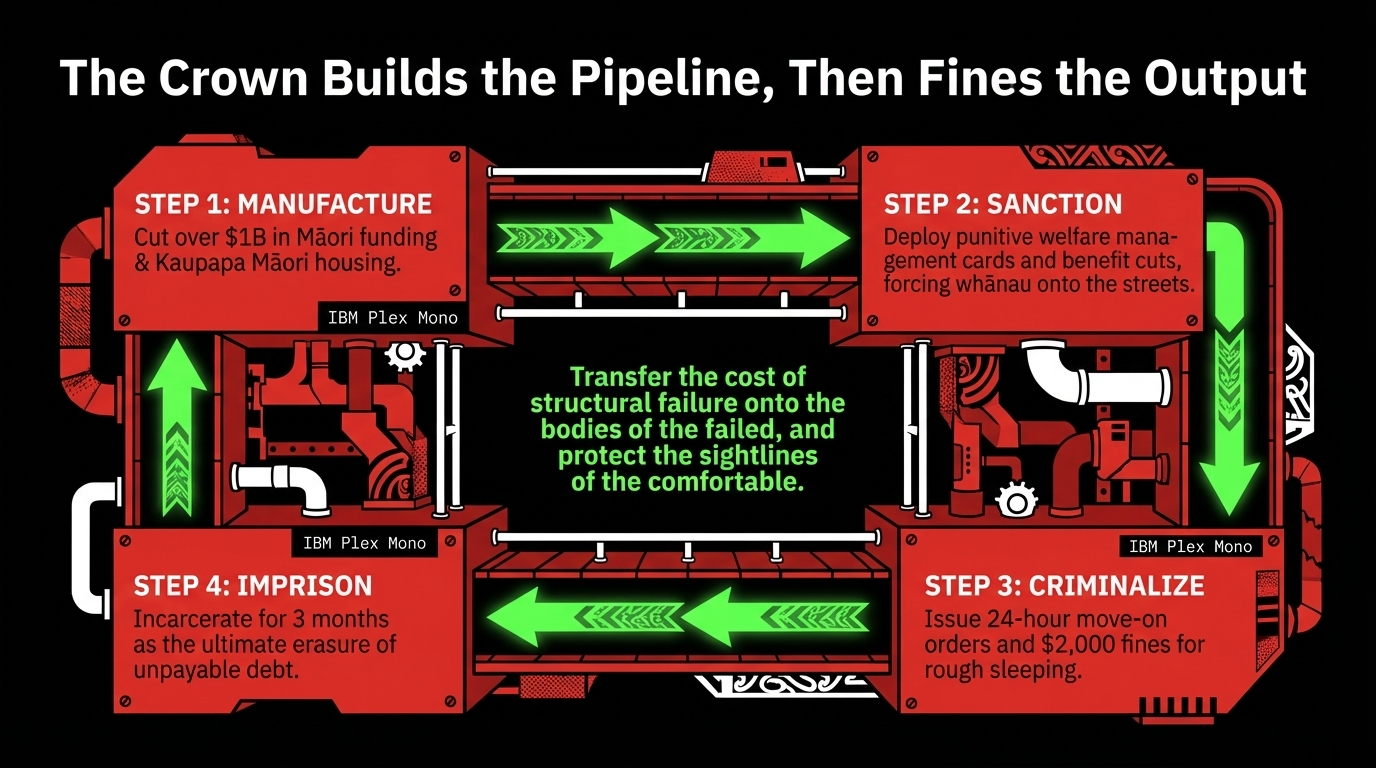 As The Māori Green Lantern exposed in the Traffic Light Taiaha essay, this government sanctions whānau into homelessness through its welfare punishment machinery — money management cards that prevent rent payments, benefit cuts, and sanctions that remove income entirely. Having engineered the pipeline from poverty into rough sleeping, it now proposes to arrest the output. The Crown builds the pipeline and then fines the water for existing.