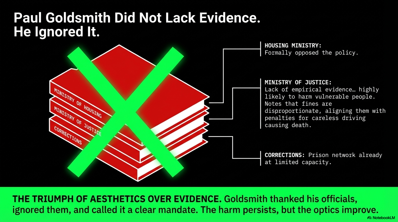 The Ministry of Housing didn't support the policy. The Ministry of Justice didn't support the policy. Corrections warned that prisons were already at capacity. Goldsmith called this "a clear mandate to restore law and order" and proceeded anyway. He does not govern with evidence. He governs with aesthetics.
