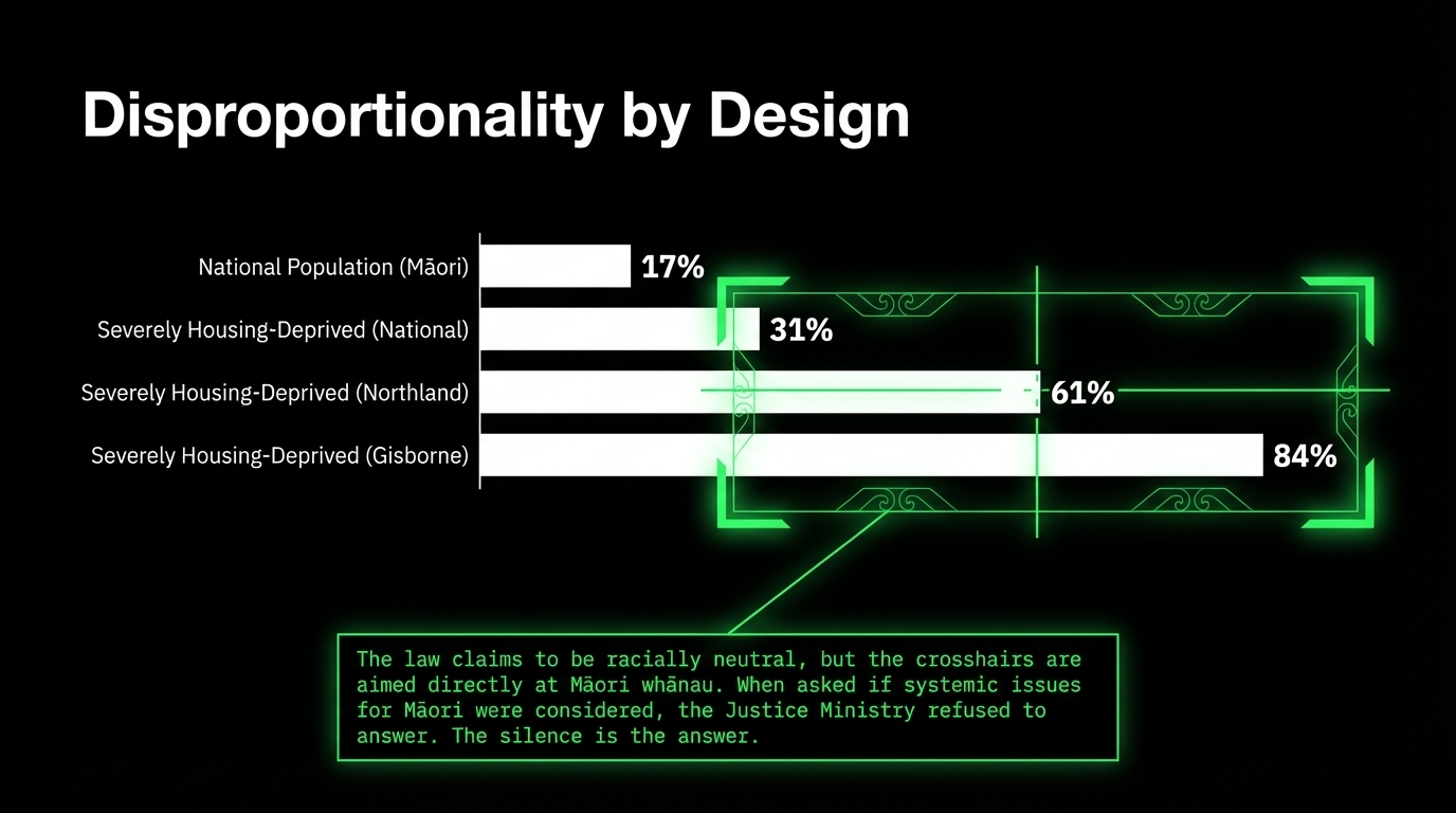 According to Stats NZ, Māori are approximately 17 percent of Aotearoa's population — but represent 31 percent of those in severe housing deprivation. In Gisborne, Māori make up 84 percent of the severely housing-deprived. In Northland, 61 percent. These are not statistics. These are the names of whānau this law will target — disproportionately, predictably, systematically.