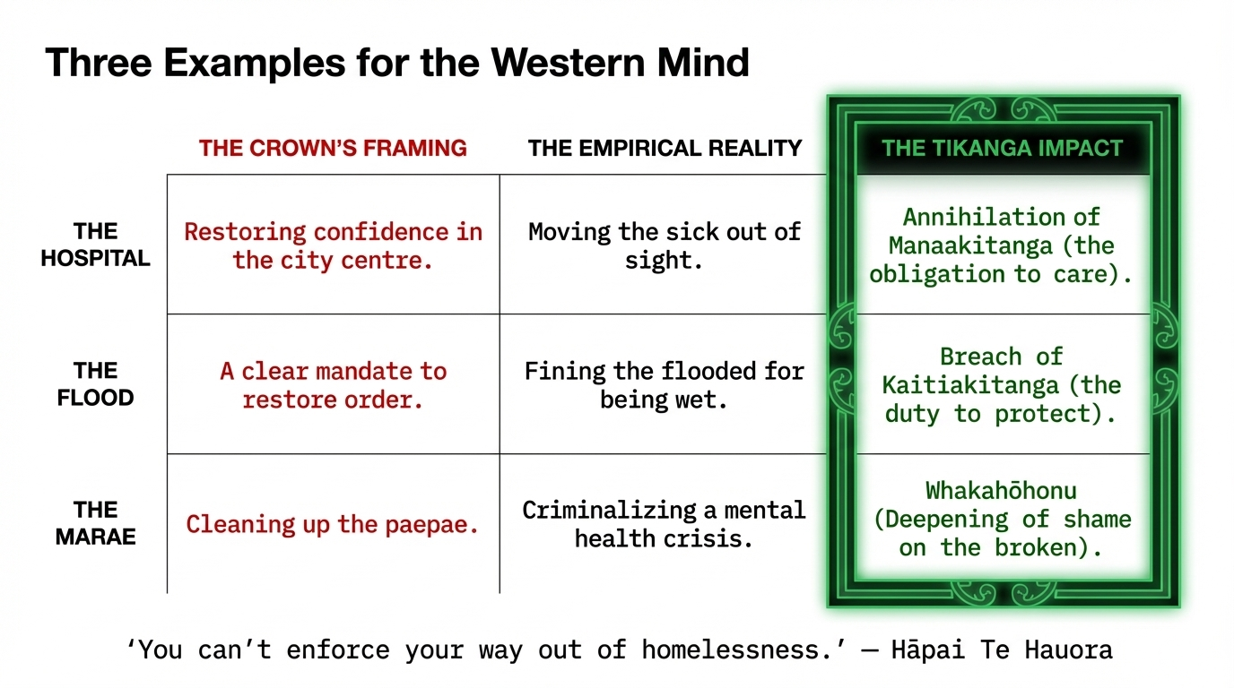 Impact on Tikanga: In Māori society, the paepae is a place of honour — where elders speak truth, where community gathers, where whakapapa is enacted. To sweep people off it — to treat the presence of the suffering as the problem — is an act of profound whakahōhonu, a deepening of shame onto those already broken. Western law does not recognise this harm. Te Tiriti does.