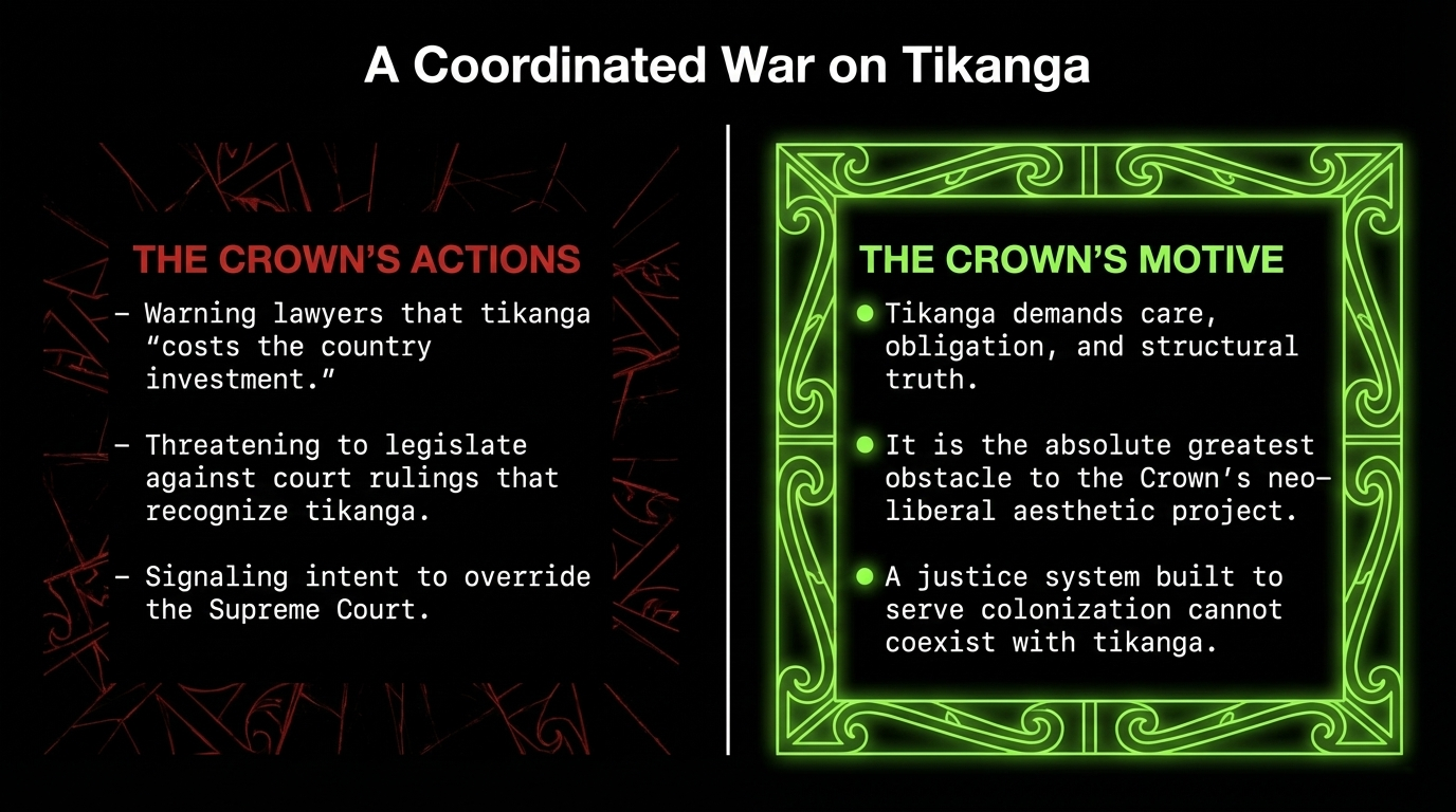 Just months earlier, Goldsmith warned lawyers that tikanga Māori in courts could "cost the country investment" and threatened to legislate against court rulings that recognised tikanga. He signalled that the government would override Supreme Court decisions if they disagreed with the outcomes. This is not judicial policy. This is a minister who wants a justice system that serves colonisation — and who understands, correctly, that tikanga is its most powerful obstacle.