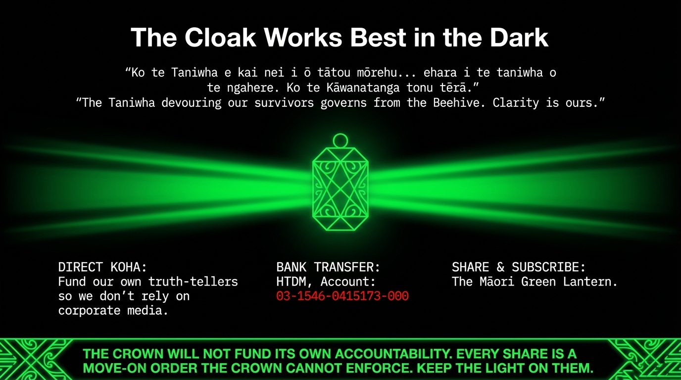 The Taniwha devouring our survivors is not from the forest. It governs from the Beehive. The cloak is its weapon. Clarity is ours.