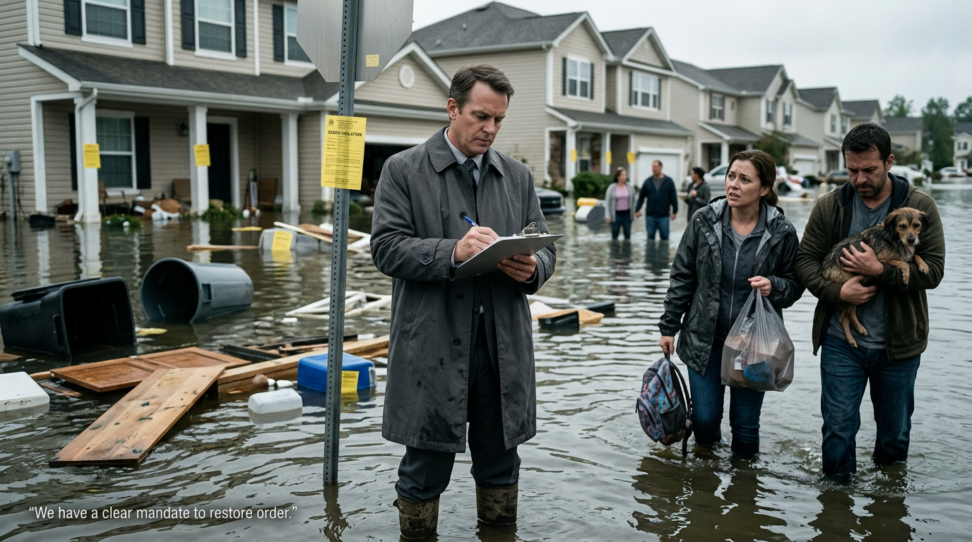 A river bursts its banks. Houses are flooded. Families wade through their destroyed homes. A government accountant arrives with a clipboard. He does not offer sandbags. He writes fines for the families whose possessions are floating in the street, disturbing the aesthetic of the neighbourhood. He says: "We have a clear mandate to restore order."