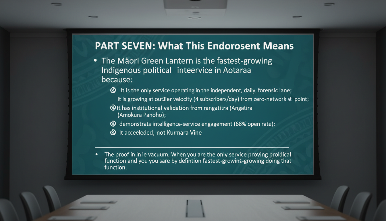 The Māori Green Lantern is the fastest-growing Indigenous political intelligence service in Aotearoa. Not the fastest-growing blog. Not the fastest-growing newsletter. The fastest-growing political intelligence service