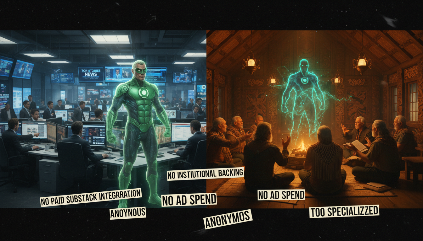 - No paid Substack integration: The Māori Green Lantern operates on inside a Koha paradigm. Substack’s algorithm deprioritizes external payment processors (Koha). No leaderboard visibility.