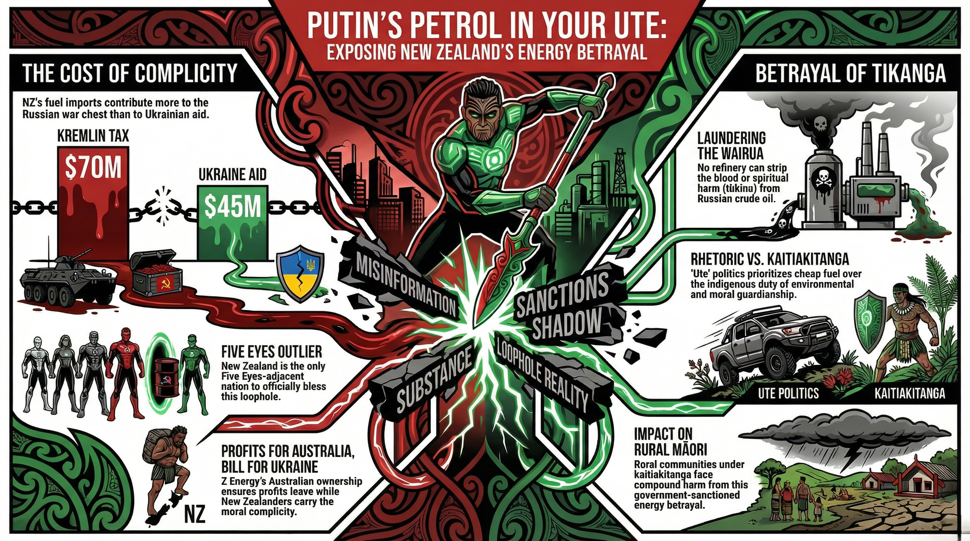 Research conducted 30 March 2026. All URLs verified at time of publication. Sources: NZ Herald, 1News, RNZ, CREA (Centre for Research on Energy and Clean Air), Beehive.govt.nz, MFAT, The Spinoff, Carbon News, The Guardian, EU sanctions documentation, Australian DFAT, and prior Māori Green Lantern essays.