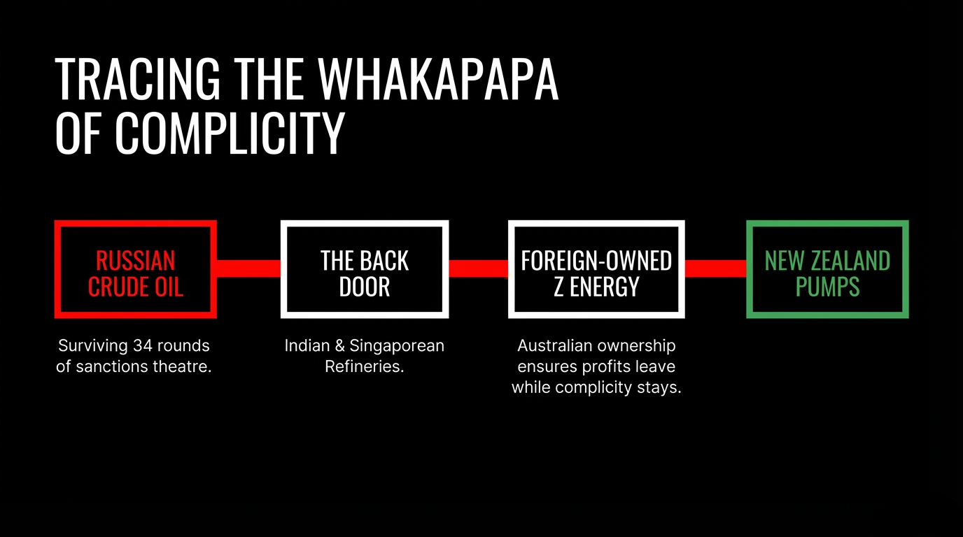 This essay named what no press release will name: that NZ's fuel supply chain is sending more money to the Kremlin each year than we give Ukraine in humanitarian aid. That the government knows. That it chose to bless it anyway.