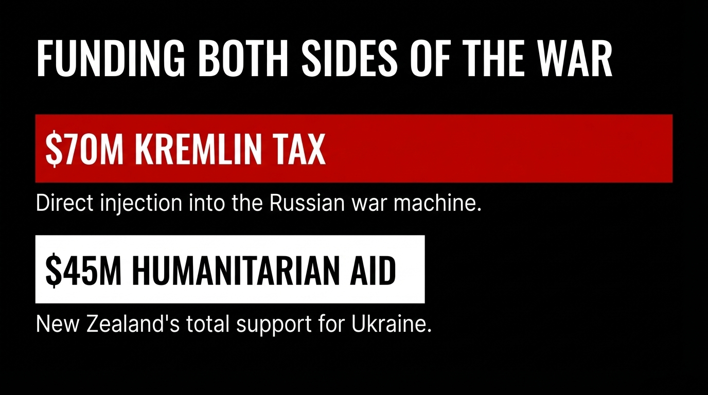 The Centre for Research on Energy and Clean Air (CREA) calculated that those imports generated approximately $70 million in Kremlin tax revenue. Seventy million New Zealand dollars. Flowing directly to the Russian federal budget. Which directly funds the missiles. Which directly fund the mass graves.