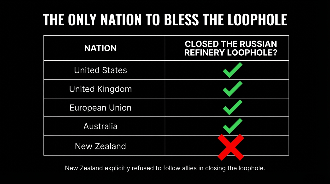 It threatened imprisonment and million-dollar fines. But it left one door hanging wide open: refined fuel from a third country — India, say, or China — was not considered Russian, even if it was made entirely from Russian crude. Western governments called this the "refining loophole" and 1News exposed its operation in November 2025, revealing that nearly $100 million of Russian-origin fuel had been imported through India's Jamnagar refinery over the prior year alone.