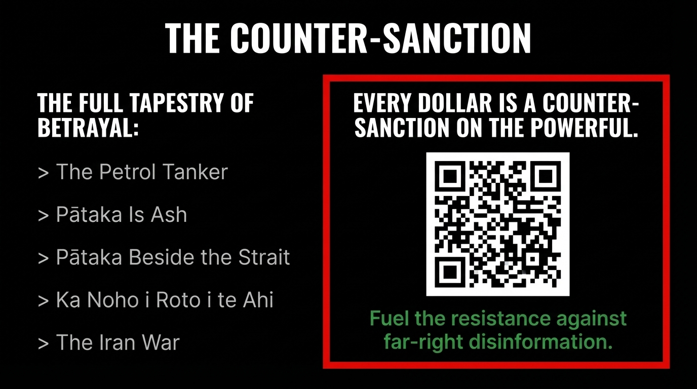 If you cannot koha — no worries at all. Read. Share. Kōrero with your whānau. Forward this to every person who filled up their ute this week and didn't know whose war they were funding. That is koha in itself. That is how the truth travels.