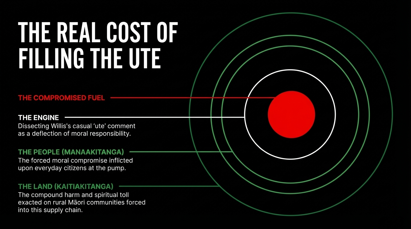 The tikanga dimension: Kaitiakitanga — intergenerational guardianship — demands that every decision be tested against the question: what does this leave for our mokopuna? This government's energy policy answers: debt, dependency, and depletion. It has blocked the fossil fuel transition roadmap at COP, as RNZ documented Shane Jones shutting down NZ's involvement in global climate frameworks. It has deferred the diesel reserve improvement to 2028. It has kept the sanctions loophole open. It has handed fuel relief to National's voting base while leaving the most vulnerable to absorb the cost. In tikanga terms, this is not just policy failure. It is an attack on the intergenerational covenant itself.