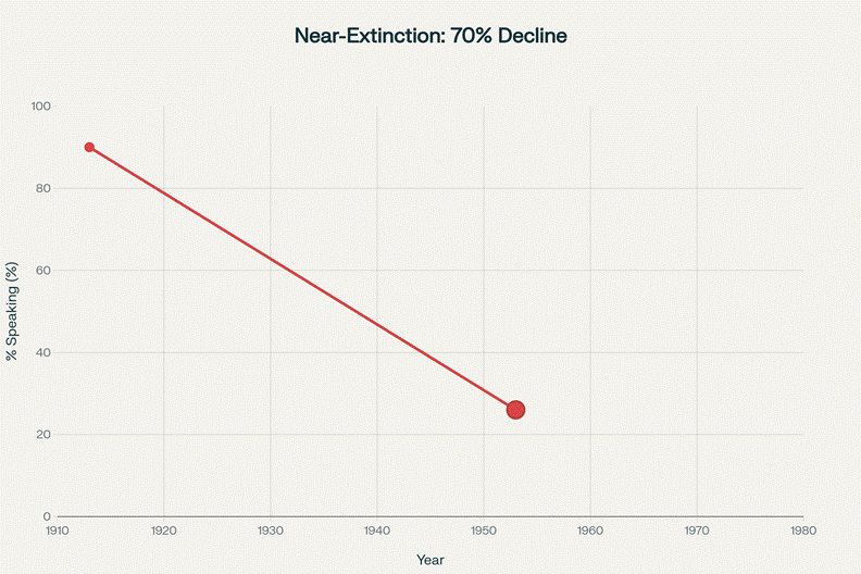 The result: in 1913, 90 percent of Māori schoolchildren spoke te reo. By 1953, only 26 percent could do so—a 70 percent collapse in one generation.