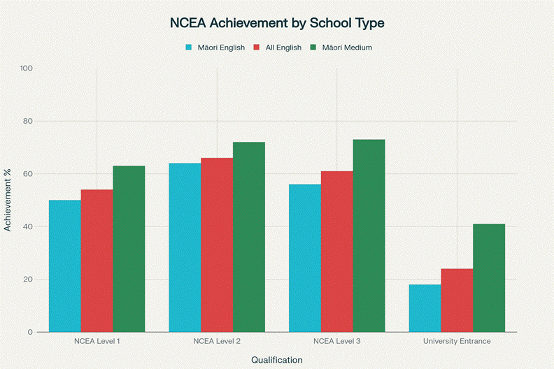 Comparison of NCEA achievement rates showing Māori students in Māori-medium education consistently outperform their peers in English-medium settings across all qualification levels (2024 data).